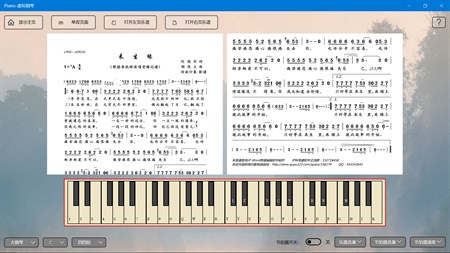 使用电脑键盘作为钢琴按键的虚拟乐器。多种音色,支持和声和打击乐伴奏。歌谱显示。(可将图片和文本格式的曲谱放入曲谱本显示)