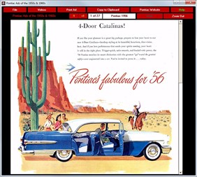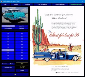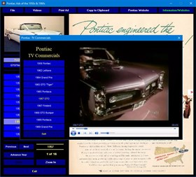 Pontiac Ads of the 1950s & 1960s. Take a nostalgic tour through history. Experience the style and hype of the automobile advertising industry from the glory days of cars. This DVD-ROM includes nearly 600 Pontiac magazine ads as they appeared during the period. They're all here: the Pontiac, Grand Prix, Tempest/GTO, Firebirds and other models. PLUS 10 TV commercials. This is the largest collection of the Pontiac ads available in a single resource. All ads may be printed directly from the software or may be copied to disk or the clipboard for processing in any graphics package.
