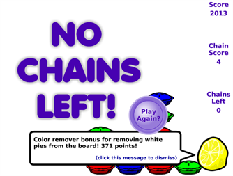 Pop Pies! is a simple yet addictive game. Explode chains of adjacent like-colored pies for points. The bigger the chain, the more points you get. The rest of the pies then settle in to fill in the gaps, hopefully creating more chains for you to pop. Some pies have gift boxes on them; pop as many of those in the same chain as possible for more points or special items. Start with a board of 99, 208, or a whopping 340 pies! How many points can you get before there are no more chains left?