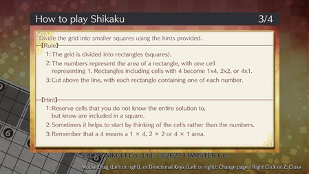 "Shikaku" is one of Nikoli's own original casse-tête, with simple rules and a unique feeling of solution. Until you get used to it, you'll tend to solve the casse-tête with guesswork, but the real charm lies in solving them with logic. Once you master the method of solving the casse-tête by gradually stretching squares from the numbers, you'll be able to enjoy "Shikaku" on an even deeper level.
