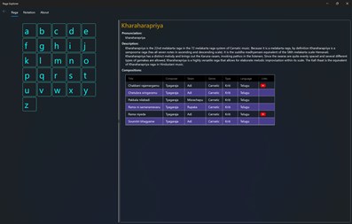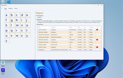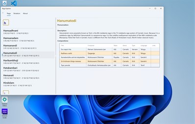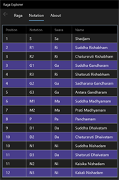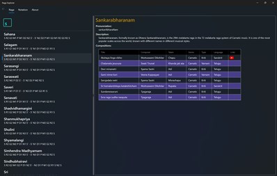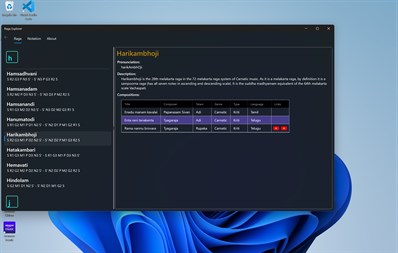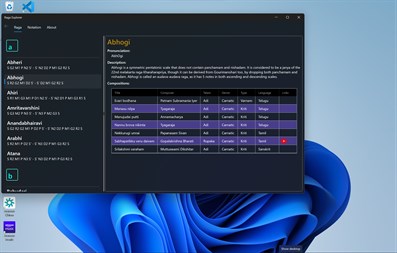 Raga Explorer lists all the 72 Melakarta (fundamental) ragas and a select few Janya (derived) ragas in Indian classical music. For each raga listed, the arohanam (ascending scale) and avarohanam (descending scale) are readily made available at your fingertips. Click on a raga to get the next level of details for the raga selected. This program uses the standard notation conventions described in the Wikipedia (https://www.wikipedia.org).