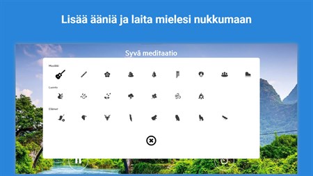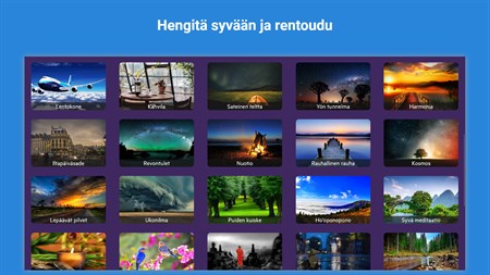 Teräväpiirtovälitysäänet: ★ Rauhallinen järvi ★ Lempeä aamu ★ Auringonnousu ★ Chakraparannus ★ Taivaan ääniä ★ Täydellinen sade ★ Maaginen matka ★ Syksyinen metsä ★ Luostarin äänet ★ Merenrantarentoutuminen ★ Temppeli kukkuloilla ★ Mystinen temppeli ★ Kesäyö ★ Maaseutu ★ Trooppinen valtameri ★ Yö tuikkivien tähtien kanssa ★ Selkeitä unia ★ Vuoristotuuli ★ Puistotunnelmaa ★ Lentokone ★ Kahvila