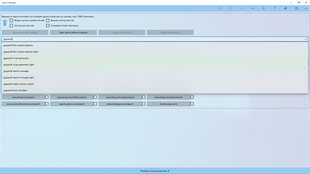 This app optimizes the management of personal search requests for configurable search providers such as search engines, online shops and online lexica. It offers a suggestion function that works similarly to the suggestion function of the well-known search engines on the Internet, but only uses the requests saved by the app. For this purpose, every request is saved and forwarded to the selected search provider by linking the request text to the configured links of the search provider and normally opening it with the browser as the standard program. For each request, in addition to the request text, an optional link, the number of calls and a timestamp of the last call are saved by inserting or changing so that each request text is unique. All data is only stored locally on the device, and the app does not require authorization for Internet access or any other authorization during installation. When entering a new request in the search field, a maximum of 10 of the saved requests are suggested, which complete the entered text in the search field without distinction between upper and lower case. By default, the suggestions for the search field are based on the saved requests, which complete the search text to the right and are sorted first by the number of calls and then by the timestamp of the last call, but without a search text, they are only sorted by the timestamp. This standard behavior can be adjusted with the four checkboxes above the search field, so that the number of calls is always or never used for sorting, the sorting direction is reversed for the timestamp, or the search text is completed in both directions.