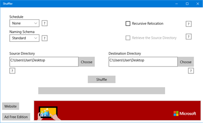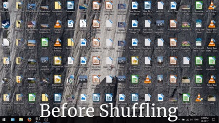 Shuffler is a file sorting utility. Its main purpose is to keep the files on your desktop sorted for you. So you don't have to ever again manually do it yourself. It does it by moving files from the Desktop to appropriately named folders such as: Documents, Pictures, Videos and so on... based on the file types.