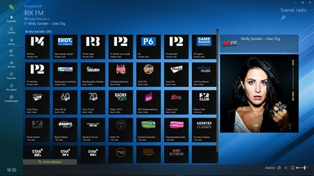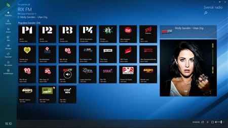 Översikten "Nu spelas" anger program eller låt som spelas för dom flesta kanaler. Helskärm uppspelningsläge med val av bakgrunder (Windows Desktop).