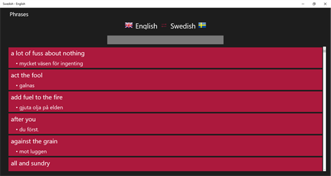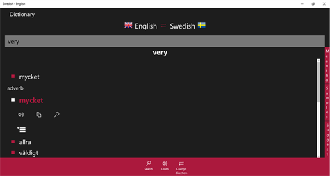 •English → Swedish 92,000 words and phrases. •Swedish → English 90,000 words and phrases. •English irregular verbs. •Test, flashcard, listen test, writing, dual game and more... •English ↔ Swedish translator (online). You can translate text and listen. •2,700 phrases