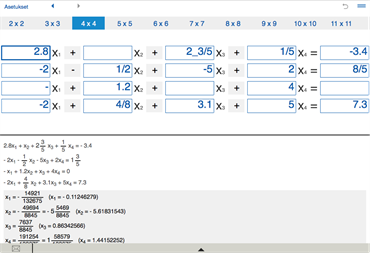 Lineaarisen yhtälöparin ratkaiseminen (2x2, 3x3, 4x4, 5x5, 6x6, 7x7, 8x8, 9x9, 10x10, 11x11).
