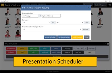 7) Scheduling Use this feature to schedule (random) presentation slots either individually or as a group without the need to manually work out each slot's timing as everything will be done for you. You can even email the scheduling slot straight away to all your students. (By the way, this is my favorite feature.)