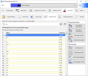 The Prime Machine HD is an English language learning, teaching and research tool, designed to provide users with a multitude of examples from corpus texts and additional information about the contextual environment in which words and combinations of words occur.