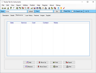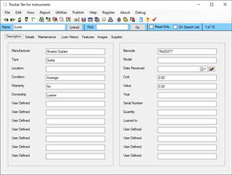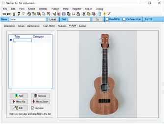 Tracker Ten for Instruments is a full-featured database system that tracks all types of musical instruments. It is ideal for personal collections, schools, bands and more. You can use the software to easily organize and track your inventory, and to maintain detailed maintenance records. The software also has a loan tracking area to keep track of instrument loans. The software features advanced reporting, graph generation, data export, a powerful search engine, full customization, optional web publishing and more. The software can also generate full color reports, incorporating images, great for accurate insurance record keeping.