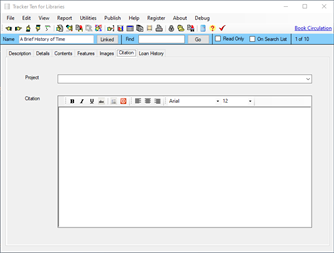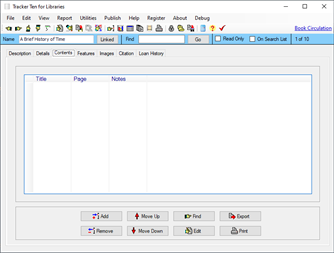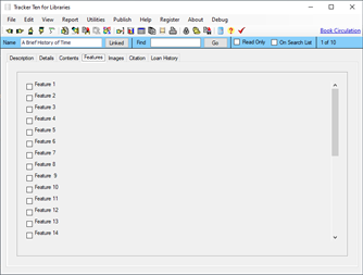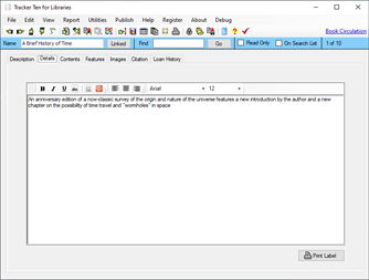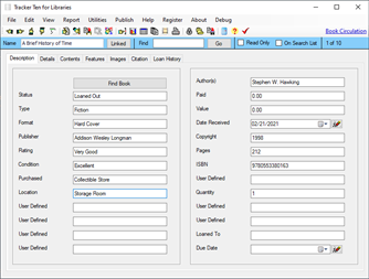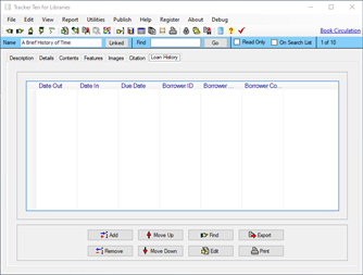 Tracker Ten for Libraries is a full-featured database system designed for small libraries. You can use the software to keep track of all types of books, magazines, videos, CDs and other media. For each item you can track title, author, subject, publisher, copyright year, date received, cost, image, value, minimum desired quantity, current quantity, ISBN, supplier, location, notes and much more. You can also record a loan history for each item, and you can generate reports showing you which items are overdue. The software also supports most barcode readers and can automatically generate and print barcodes. In addition, you can also use your barcode reader to easily jump to items in your database. The software features advanced reporting, graph generation, data export, a powerful search engine, full customization, optional web publishing and more.