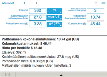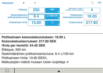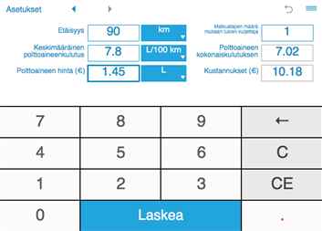 Laskin voit laskea polttoaineen määrä (polttoaineen kokonaiskulutuksen) ja hinta matkalle (polttoainekulut).