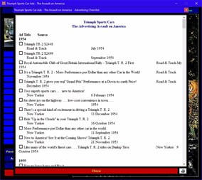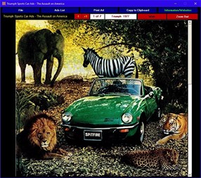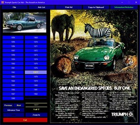 Triumph Sports Car Ads - The Assault on America. Take a nostalgic tour through history. Experience the style and hype of the British automobile advertising industry from the glory days of cars. This multimedia title 237 Triumph (1954 - 1982) automobile ads as they appeared in US, British and other magazines of the period.