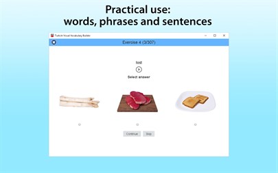 Thanks to our unique learning method, you will soon achieve great results on the path to mastering Turkish. Vocabulary Builder is ideal for anyone wishing to learn some words and phrases for use on holiday, as well as those looking to brush up their language skills.