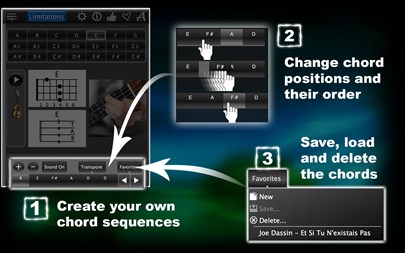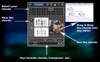 You can: - see the chords in standard string representation, in TAB-representation, as colored photos in one position, - save and load the chords sequences, - listen to the chords you picked with original instrument sound, - drag and drop the chords into your documents, - transpose the chords to level which is optimal for you.