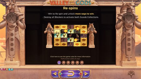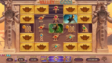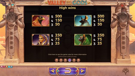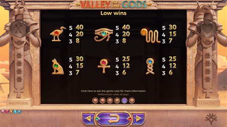 Valley of the Gods video slot features and bonuses Main screen consists of five reels, five rows and up to 3125 ways to win. The paid combinations are made from three, four or five similar symbols, placed on the neighboring reels starting from the first one on the left.