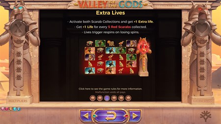 Game starts with 12 inactive fields on the screen covered with a scarab symbol. Every time a win is scored, a number of fields corresponding to the number of symbols in winning sequence will activate. Once entire screen is activated, every win will provide red or blue scarab symbols which will power two meters on the sides, granting additional multipliers and extra lives once they’re filled.