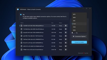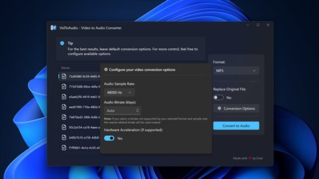 VidToAudio is a powerful Windows app designed to convert videos to audio files with ease. With VidToAudio, you can extract audio tracks from various video formats, including MP4, AVI, MKV, MOV, WMV, and more, and save them as popular audio formats like MP3, WAV, AAC, and others. Whether you want to extract music, speeches, or sound effects from videos, VidToAudio provides a user-friendly interface and efficient conversion capabilities. Simplify the process of converting videos to audio with VidToAudio - the ultimate video to audio converter.