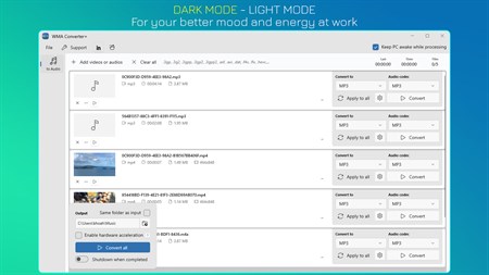 • Enable hardware acceleration to save time. • Auto shutdown when completed. • Save time with multiple files processed at once or focusing on a single video. • Keep PC awake while processing.