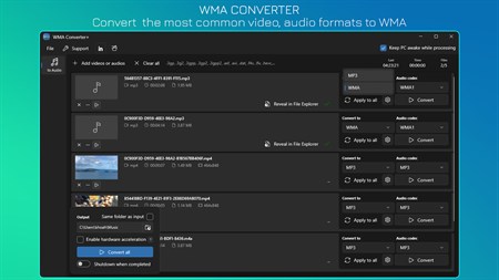 Convert MP3 to WMA Convert any video, audio to MP3, WMA. Convert MP4, MOV, MKV, AVI, WMV, WEBM, MXF, M4V, ASF, VOB, FLV, 3GP, TS, OGG, OGV, MP3, AAC, OGG, FLAC, M4A, M4B, CAF, WAV, AIFF, WMA, AC3, MP2 to WMA, MP3. ???? Convert multiple files at once, there's no limit to how many files. ???? All processing is performed locally on your computer where your files remain safe and private.