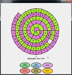 Find words on the WordSpiral to eliminate them from the game board. Try to eliminate all the letters on the Spiral Board. Watch the Spiral Board shrink after each word is found. How many turns does it take to clear the board? THEN - ask WordSpiral to Solve the same board you just played and see how many words it is able to find.