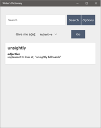 An offline dictionary for writers. Search for a word in our database with over 100,000 entries, or use our random feature to generate adjectives, adverbs, nouns and verbs to help with your writing!