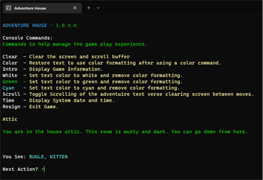 Welcome, Text Adventure Fans! Adventure house is a simple, family-friendly text adventure that anyone can enjoy. The object of the adventure is to escape the house before you die. Spend the next hour or two exploring the house gathering the items you need to survive and escape. Enjoy the retro-style command interface and the old-style feeling of solving the puzzle. The game if perfect for players of all ages.