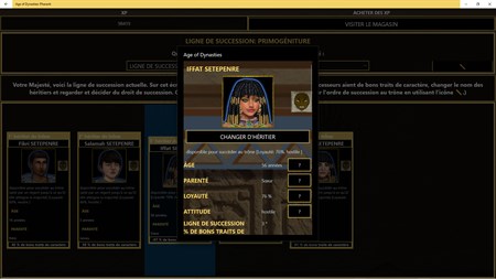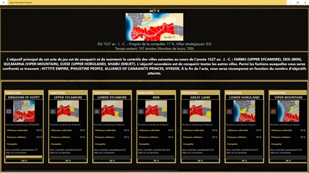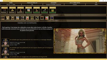 Ce jeu d'empire et de stratégie au tour par tour vous permettra de réécrire l'histoire de la civilisation de la vallée du Nil depuis l'Ancien Empire en 2300 avant J.-C. jusqu'au Nouvel Empire en 1300 avant J.-C., en incarnant plusieurs rois et reines qui montent sur le trône comme Cléopâtre VII, Ramsès II, Cheope ou Toutankhamon.