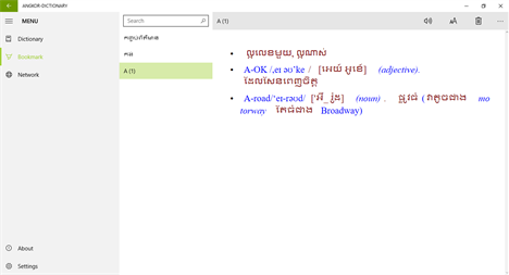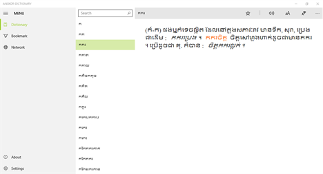 Angkor dictionary is an application that has more over 60000 words that provides you three dictionary options such as English-Khmer, Khmer-English, and Khmer-Khmer. With this hard effort of our team, Angkor dictionary was built to make English and Khmer learners to have better using of English and Khmer words correctly. In the last, we hope it would help you to build a good education with vocabulary.