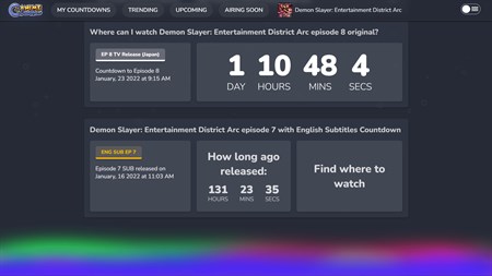 Anime Countdown, the ultimate app for anime fans! This app provides a countdown to the release of new anime episodes, so you can always be up-to-date on your favorite shows. Plus, you can check out trending anime and get excited about upcoming releases! Whether you're a hardcore fan or just getting started, Anime Countdown is the perfect app for you.