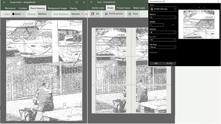 "Assist Painter" is digital tools made for “analogue painters" who prefers to hand-painted paintings than digital paintings. That has a variety of functions that can be used when you produce watercolor and oil painting by actual brush. ⦁You can examine the composition of a painting by trimming a picture, rearranging an object, or drawing any object into it. ⦁It is possible to confirm the existence of light/shadow and the line/shape in the picture by monochromatic image, contour line, rough sketch, etc. ⦁You can print a rough sketch of large size poster (F10 size as example) to use it for tracing the picture into paper. ⦁Using a function of reducing colors and a function of analyzing water-color or oil-color, you can study the color arrangement in a picture. ⦁When uploading the photograph of watercolors or oil paintings to Web sites etc., you can use functions such as trapezoid correction, color adjustment, attachment of picture frame, and adding the copyright protection watermark. ⦁Using these functions, you can make picture postcard, poster of large size, etc.