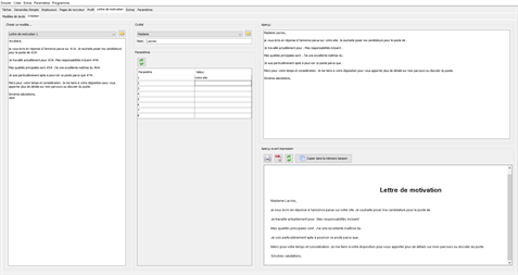 Il y a aussi la possibilité de rajouter des modèles de lettre de motivation. Vous pouvez paramétrer vos modèles selon votre souhait, en saisissant les valeurs des paramètres entre les symboles #. Une fois les valeurs nécessaires introduites, la lettre est générée automatiquement.