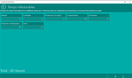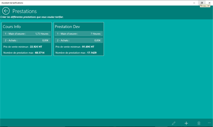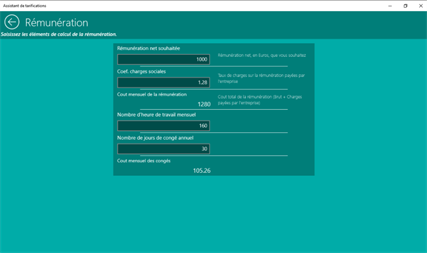 Vous saisissez sa dénomination social, les conditions de rémunérations que vous souhaitez ainsi que vos frais fixes. A partir de là, il vous suffit de décrire vos prestations et l'application s'occupe de calculer pour vous le tarif minimum à facturer pour atteindre vos objectifs.