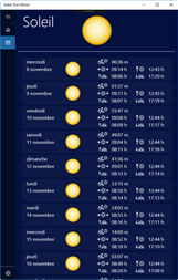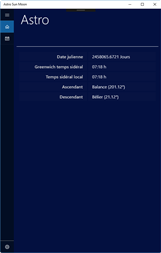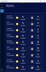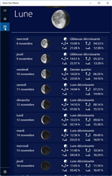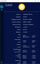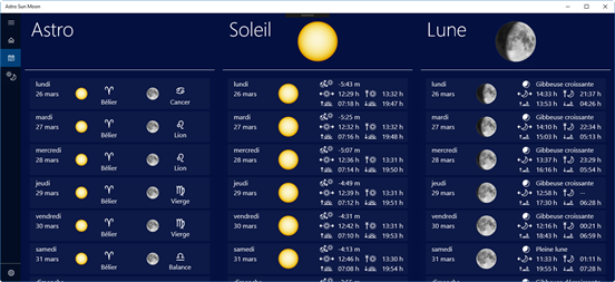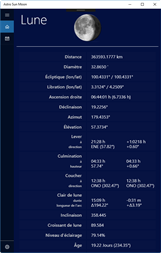 Astro Sun Moon affiche les données actuelles du soleil et de la lune, la date astronomique et le signe du zodiaque. L'application comprend également un calendrier du soleil et de la lune avec les dates pour le lever du soleil, culmination, coucher du soleil, clair de lune et les phases de lune des 30 prochains jours. Une vue supplémentaire permet d'afficher graphiquement les positions du soleil et de la lune et d'animer leur mouvement pendant la journée en cours.