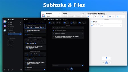 Each entry/task has: • Markdown notes • Progress tracking • Due date • Files • Subtasks • Phase