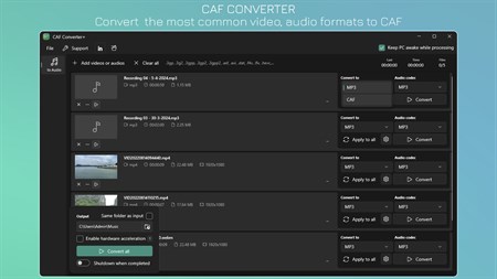 Convert MP3 and more audio input formats to CAF: • MP3, AAC, OGG, FLAC, M4A, M4B, CAF, WAV, AIFF, WMA, AC3, MP2.