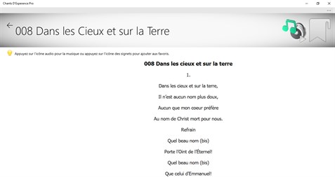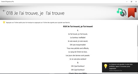 Chants D'Esperance avec mélodies vous permet d'accéder à toutes les paroles du livre de chanson Chants D'Esperance. Certain airs sont également inclus avec les paroles afin que vous puissiez apprendre et aider à votre adoration. Caractéristiques supplémentaires: + Vous pouvez ajouter les paroles à votre liste de favoris. + Envoyer lyrics par courrier électronique. + Ecouter L'aire d'une chanson