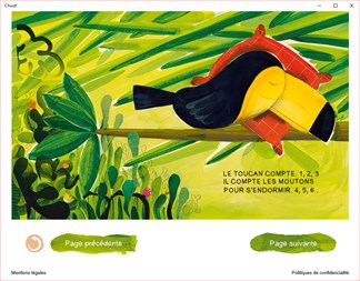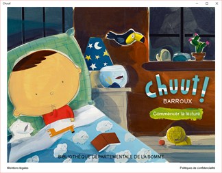C'est l'heure de se coucher et tout le monde aimerait bien dormir. Chuut! L'histoire va commencer... Découvrez la version interactive de Chuut!, le livre écrit par Barroux pour la Bibliothèque départementale de la Somme et distribué par le Conseil Départemental aux bébés nés en 2015. Dans ce livre numérique, amusez vous avec votre enfant à donner vie aux animaux et à trouver le facétieux toucan caché dans les pages, tout en écoutant l'histoire lue par l'auteur.