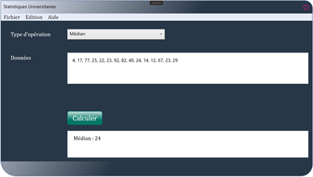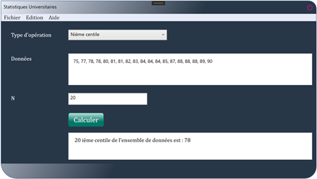 Statistiques Universitaires est une application traitant des concepts de base des statistiques tels que la moyenne, le mode, la médiane, la variance, l'écart-type, le nième centile et le score Z d'un point de données dans une population, le score Z d'un point de données dans un échantillon et le score Z a partir de la moyenne et l'écart type. Tout ce que l'utilisateur de cette application a à faire est de saisir ou de coller l'ensemble de données et d'appuyer sur le bouton "calculer".