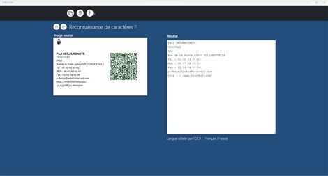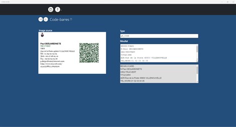 Toutefois, COM-SCAN peut-être aussi utilisée pour faire de l’OCR sur toute image comportant du texte. COM-SCAN est capable de faire de la lecture de "QR Code" mais aussi de tous les types de code-barres suivants : Aztec, Codabar, Code 39, Code 93, Code 128, Data Matrix, EAN-8, EAN-13, ITF, PDF-417, RSS-14 (toutes variantes), UPC-A et UPC-E. COM-SCAN peut générer des codes-barres Aztec, Data Matrix, PDF-417 et "QR Code" à partir d'un fichier vCard ou à partir d'un texte libre.
