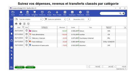- Gestion d'un seul compte bancaire. - Dépenses et revenus ventilés par catégorie. - Gestion des opérations périodiques (Loyer, salaires...). - Bilan par catégorie, sous catégorie. - Suivi du budget familial. - Synchronisation des données.