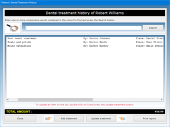 After saving the record, pressing the Treatment History button gives you access to a window where you can list and print all payments made by the patient to your dental office for the services received. To add a dental service to the list, just press the Add treatment button, fill in the text fields in the window that appears, press Save and then Close. For each dental service you must indicate the date, the type of treatment, the name of the dentist performing the service, the place where the service was provided, and the amount paid.