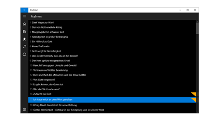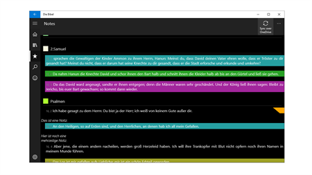 This bible reading app contains German and English Bible text. Each verse can be viewed and compared per click in various Bible translations such as the "Schlachter 2000", the "New King James Version" and the "Neue Genfer Translation". Verses can be found, highlighted, sent to friends and bookmarked. In addition, notes can be written directly next to the Bible text and are thus immediately visible when reading the verses. These notes, bookmarks, and highlights can then synced between different devices.