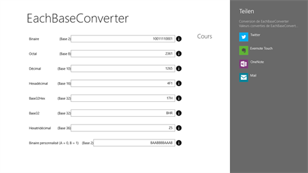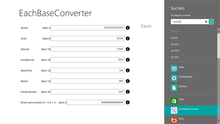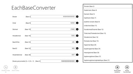 EachBaseConverter est un convertisseur de numéro pour toute base entre le système binaire (base 2) et le système hexatridecimal (base 36). Vous pouvez définir votre liste individuelle des systèmes. Vous pouvez également définir votre propre format pour chaque base. Il n'y a pas de limite pour la taille des nombres.