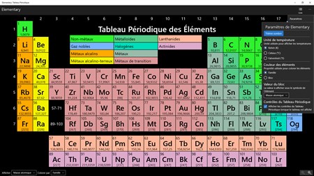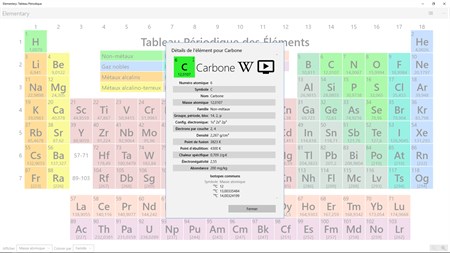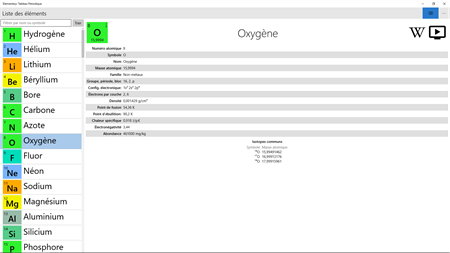 Fonctionnalités : - Tableau périodique des éléments zoomable - Cliquez sur un élément pour visualiser les détails basiques de l'élement (ex : température de fusion, densité...) - Pour chaque élément, un bouton permettant d'accéder à la page Wikipédia française dédiée à l'élément, et un autre bouton permettant de visualiser une vidéo à propos de l'élément - Gratuit, libre, open-source et sans aucune publicité!