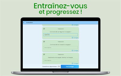 - Entraînez-vous et progressez - Vous pouvez vous évaluer sur une fiche, avec une série de questions unique et personnalisée. Les évaluations sont personnalisables selon vos préférences, et vous permettent de suivre votre progression au cours du temps : la clé est la régularité !