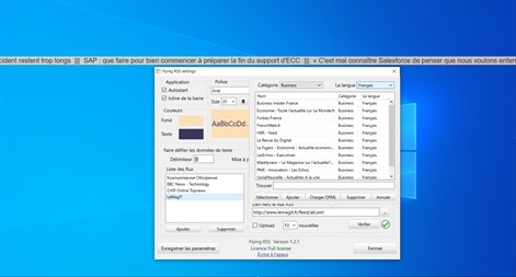 Avantages de FlyingRSS Free: - * Vous pouvez connecter un nombre illimité de flux RSS et ne recevoir que des nouvelles intéressantes pour vous sur divers sujets - un double-clic sur la ligne de défilement ouvre une liste de toutes les actualités - choix de couleur pour le texte et l'arrière-plan - choix de police, sa taille et son style - réglage de la transparence de l'arrière-plan - ajustement de la vitesse de déplacement du texte - * emplacement au-dessus de toutes les fenêtres ou comme fenêtre normale - * configurer des minuteries pour afficher une ligne à l'écran et la cacher - choix de la langue d'interface. Disponible en anglais, allemand, français, russe - Connexion facile du flux RSS. Entrez simplement son URL - * la possibilité de spécifier l'heure de mise à jour du flux RSS installé et le nombre de dernières nouvelles à afficher dans une ligne de défilement - Plus de 60 flux RSS déjà pré-installés de divers sujets en quatre langues - anglais, allemand, français, russe. La version complète de 300 flux RSS prédéfinis - la liste des flux RSS est divisée en catégories et langues pour faciliter la recherche et la sélection - * la possibilité d'ajouter votre chaîne préférée à la liste dans n'importe quelle catégorie. Ou téléchargez une liste de flux RSS à partir d'un fichier OPML * - disponible dans la version complète de l'application