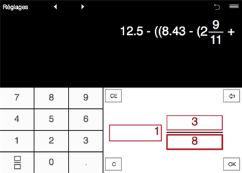 - Addition, soustraction, multiplication, division. - Calculs avec des parenthèses, y compris des parenthèses imbriquées. - Calculs avec des fractions, nombres mixtes, nombres entiers, nombres décimaux. - Entrée de fraction intuitive. - Puissance à exposant positif et négatif. - Fonctions trigonométriques: Sin, Cos, Tan. - Calculs trigonométriques en degrés et radians. - Constantes: π (pi). - Racine carrée (√ ). - Conversion de fractions en nombres décimaux et l'inverse. - Simplification des fractions.
