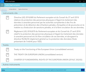 "GDPR dans votre poche" est une application gratuite pour les appareils iOS, Android et Windows 10/11 développée dans le cadre des projets SMEDATA et SMEDATA II (https://smedata.eu/) cofinancés par le "Rights, Equality and Citizenship Programme" de l'Union européenne. Son objectif est de présenter le Règlement général sur la protection des données (RGPD) aux citoyens et aux petites et moyennes entreprises (PME) d'une manière facile à utiliser et à comprendre, et de leur donner des connaissances pratiques et des conseils sur leurs droits, respectivement les obligations en vertu de la législation de l'UE sur la protection des données. L'interface utilisateur et une grande partie du contenu sont disponibles en anglais, italien, bulgare, allemand et français. L'application donne accès à une variété de ressources d'informations juridiques et de documents d'orientation dans le domaine de la protection de la vie privée et des données personnelles, organisés en deux composants principaux: la Bibliothèque juridique et le Module Conseil. 1) Bibliothèque juridique La bibliothèque juridique vous donne accès à une riche collection de documents juridiques de l'Union européenne et de quatre États membres de l'UE - Bulgarie, Italie, Allemagne et France comme suit : • Dispositions des traités internationaux et de l'UE relatives à la protection de la vie privée et des données personnelles • Résumé de la jurisprudence de la Cour européenne des droits de l'homme • Législation de l'UE relative à la protection de la vie privée et des données personnelles • Affaires emblématiques de la Cour de justice de L'EU • Lignes directrices endossées par le Comité européen de la protection des données et le Contrôleur européen de la protection des données • Législation bulgare et une sélection des cas de jurisprudence clefs de tribunaux bulgares dans le domaine de la protection de la vie privée et des données personnelles • Législation italienne et une sélection des cas de jurisprudence clefs de tribunaux italiens dans le domaine de la protection de la vie privée et des données personnelles • Législation allemande et une sélection des cas de jurisprudence clefs de tribunaux allemands dans le domaine de la protection de la vie privée et des données personnelles • Législation française et une sélection des cas de jurisprudence clefs de juridictions françaises dans le domaine de la protection de la vie privée et des données personnelles • Avis et lignes directrices de la Commission bulgare pour la protection des données personnelles • Avis et lignes directrices de l'Autorité italienne de protection des données • Avis et directives du Commissaire fédéral allemand pour la protection des données et la liberté d'information • Avis et orientations de la Commission nationale de l'informatique et des libertés. 2) Module Conseil Le module Conseil fournit des orientations pratiques sur l'application des règles du RGPD aux citoyens et aux PME. Il comprend les éléments suivants: • Le RGPD simplifié – un guide schématisé expliquant de manière compréhensible et facile à assimiler les droits des individus et les obligations imposées aux organisations ; • Outils d'Aide à la Décision – systèmes interactives qui aident les représentants des PME à trouver des solutions reposant sur les faits aux problèmes clés liés à la protection des données. Ils offrent une interface d'assistant simplifiée « Q&R » pour résoudre des problèmes pratiques (par exemple, « Mon organisation a-t-elle besoin d'un DPO ? », « Mon organisation doit-elle conserver un enregistrement des activités de traitement ? », etc.) sur la base d'une interaction étape par étape avec l'utilisateur; • Module FAQ "Foire aux questions" – donne des réponses aux questions typiques posées par les citoyens et les PME sur la base de l'expérience acquise dans les procédures de questions et réponses similaires mises en place par les autorités bulgares et italiennes de protection des données; • Dictionnaire RGPD – un glossaire des termes juridiques et des définitions introduits par le RGPD. Vous pouvez rechercher dans tout le contenu de l'application à l'aide de l'outil de recherche disponible dans le menu de navigation (dispositif de recherche globale). Vous pouvez également effectuer des recherches dans le texte des documents ouverts (dispositif de recherche locale). De plus, l'application vous offre: • La possibilité de mettre en signet des éléments de contenu (par exemple des articles du RGPD) que vous souhaitez lire plus tard • La possibilté de sauvegarder sur la carte mémoire de votre appareil le texte des documents préférés, ce qui vous permet d'accéder à leur contenu en mode hors ligne.