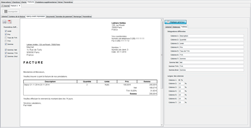 Le programme vous permet, en outre, de gérer votre base de données clients. Pour chaque client vous pouvez renseigner différentes informations telles que le nom, l’adresse, la langue, le pays et bien d’autres.